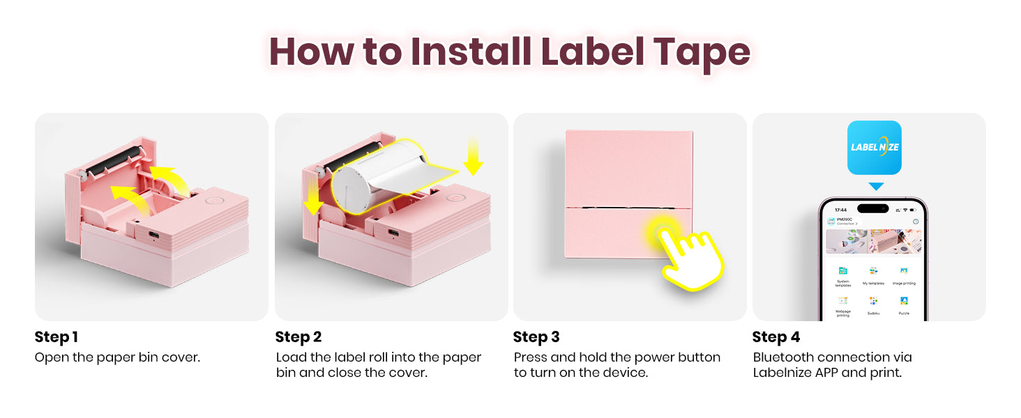3.Turn on Bluetooth on your phone, long press to turn on the PM290C sticker printer and open the Labelnize App to link to Bluetooth